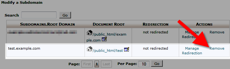 On the next page, you will see all your Subdomains listed. Click the Remove link beside the domain you want deleted.