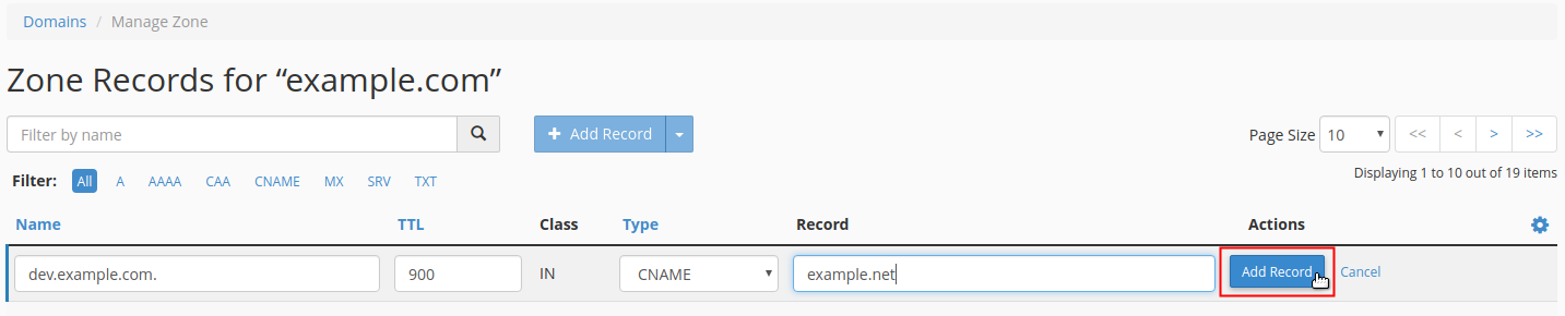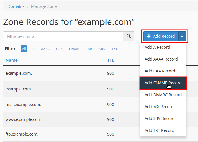 The Zone Editor can be utilized for creating common DNS records, like, A, CNAME, and MX records. Through the Manage link, you can add custom DNS records, such as, CAA, TXT, AAAA, and SRV records. The instructions below provide the general steps to create DNS records.