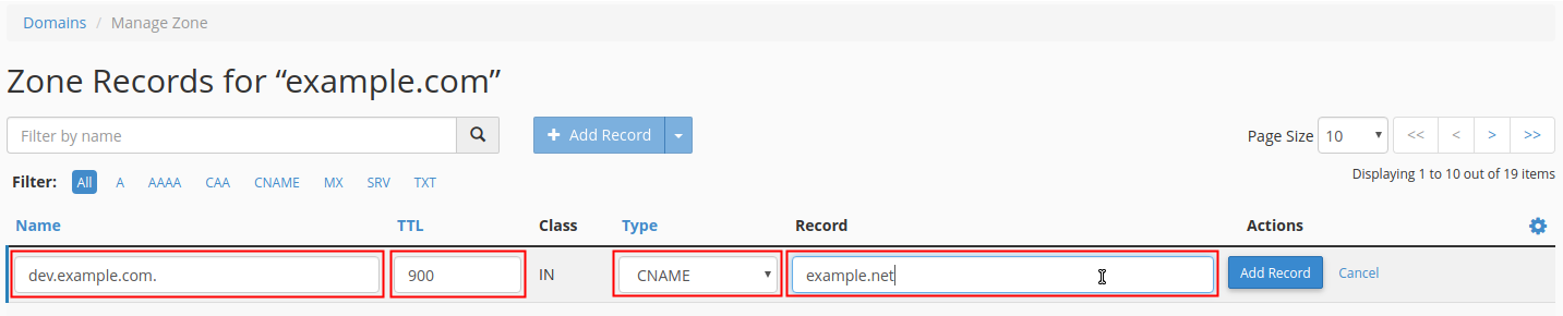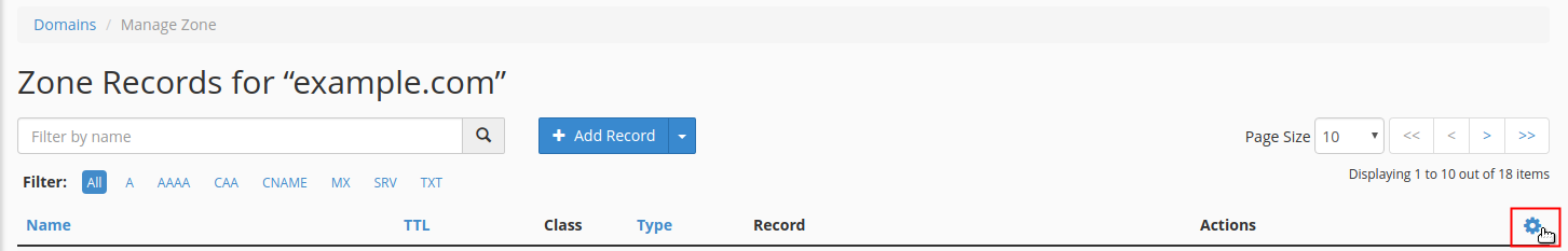 The Zone Editor is capable of displaying up to 100 items per page. For easier viewing, you can filter the DNS records displayed.