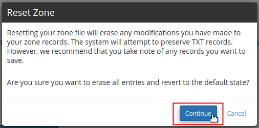 When you add a domain to cPanel, a standard set of DNS records is automatically created. If you add/delete DNS records and want to revert back to the original DNS, you can Reset the DNS Zone. This will remove all your custom DNS records and create the standard records for your domain. The instructions below provide the steps to reset your DNS zone file.
