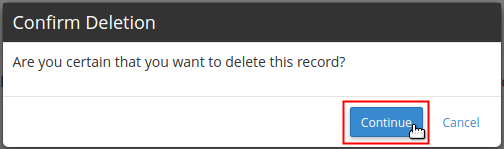 A pop-up dialog box appears and asks "Are you certain that you want to delete this record?" Simply click the Continue button to confirm and proceed to delete the record.