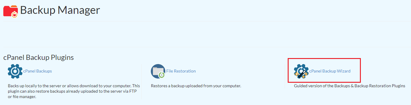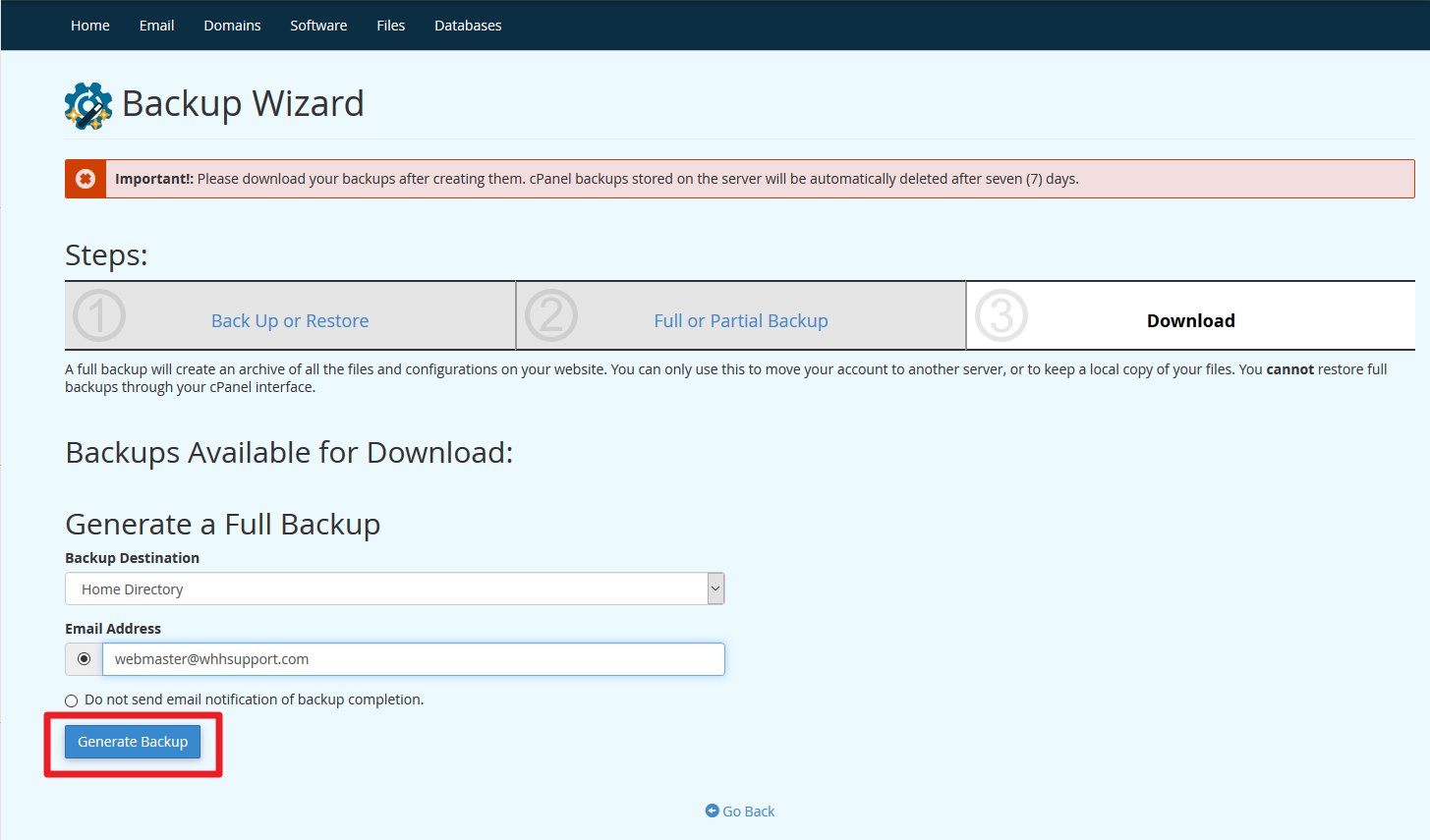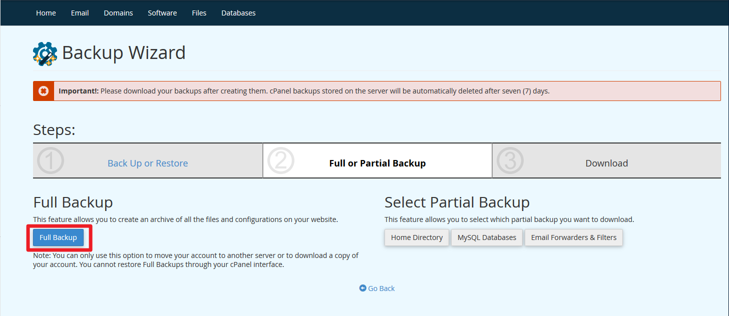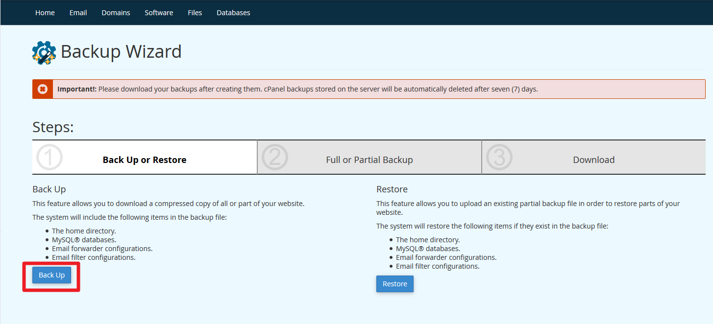 In cPanel, using the Backup Wizard, there are two different ways you can generate backups of your account. You can generate and download one backup file of your entire account, which includes all of your files and databases or you can create and download backups of these items individually.