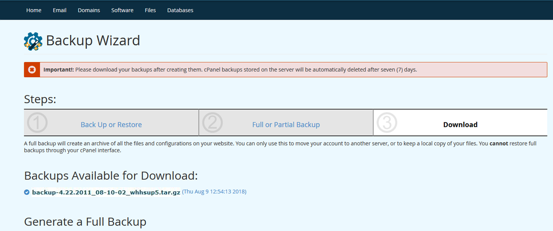 We'll start off below by showing you how to generate the full backup, and then we'll explain how to download individual backups of your files and your databases.