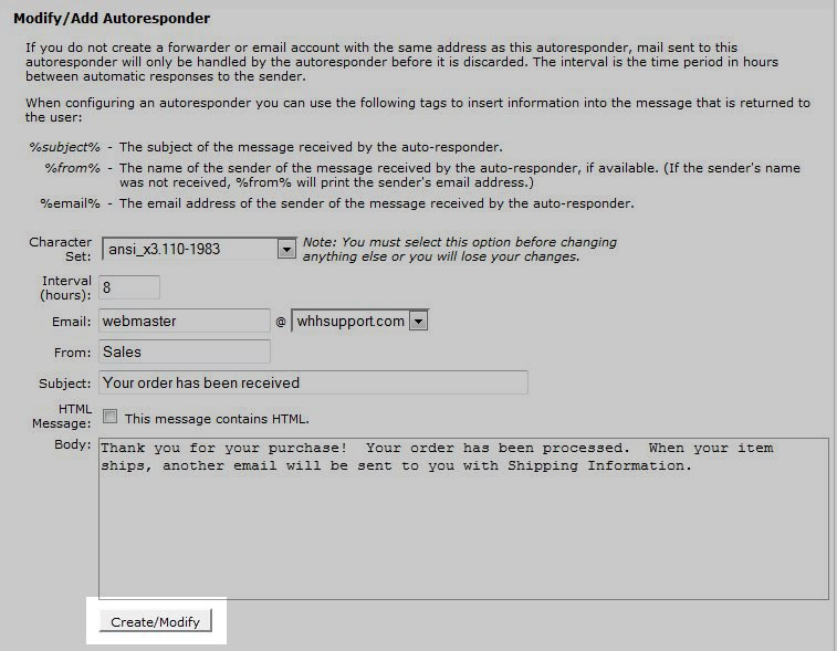This is where you will create your autoresponder. Once you have filled in the information, click on "Create/Modify:"
