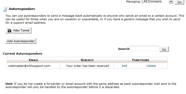 In the previous tutorial in our using email series we showed you how to modify an MX record. An Autoresponder is a feature within your Email Settings that allows you to send an email automatically when an email is sent to a specified email address under certain circumstances. This is great if you are on vacation and want to send an email automatically to anyone that sends you an email to let them know you are out of town until a certain day. You also can use it if you have a customer service email to let your customers know that their email has been received and they will get a response shortly.