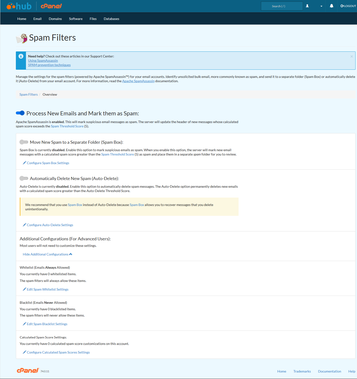 Spam Filters, the new cPanel interface for Apache SpamAssassin, is a free tool that helps block spam from reaching your inbox. It's disabled by default but can be enabled in cPanel in only a few steps.
