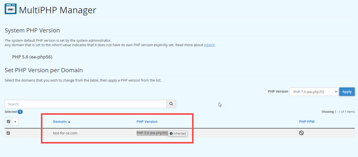 Select the domain(s) you wish to change to a new PHP version by clicking on the checkbox next to the domain in the table.