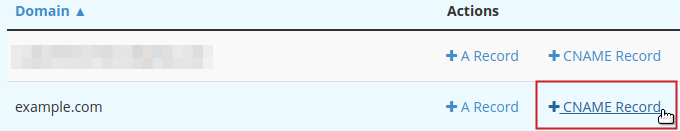 Find your domain in the list under the Domain heading. Under the Actions heading, click on the +CNAME Record link that corresponds with the domain you want to add the CNAME record for.
