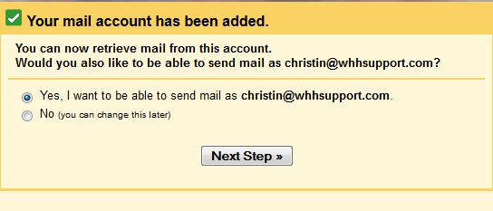 Step 4: After you have added your website email account, you'll be presented with the option to send email (through Gmail) with the email address you just set up in Gmail. You can go in at any time and change this if you like. If you simply want to check your email through Gmail and do not need to send email from that address through Gmail you can choose "No" on this screen. Refresh Gmail and your Web Hosting Hub email will be checked automatically from now on with Gmail.