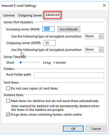 | Deleted items | Mark items for deletion, but do not move them automatically. Items marked for deletion only get deleted when you purge the deleted items. Purge items when switching folders while online. This is set by default. This option removes the items automatically when switching to another folder while online. |