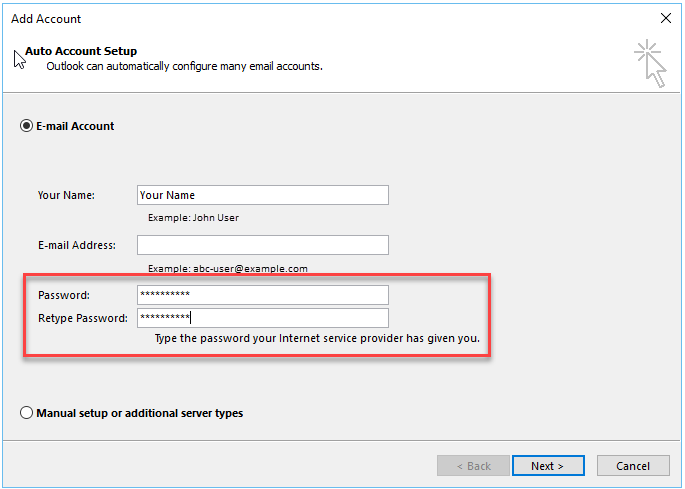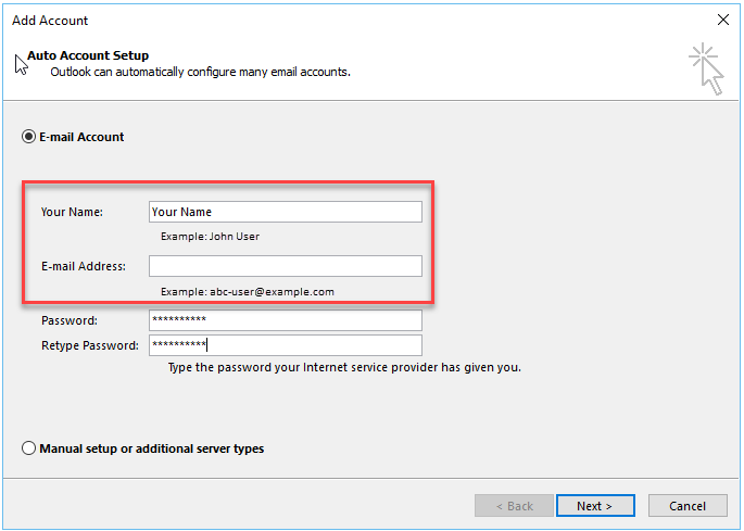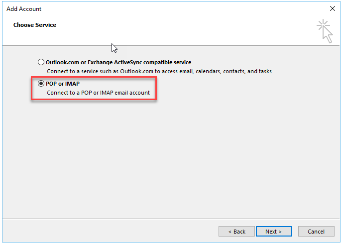 By default, the Email Account should be selected. Note that email accounts must already exist within the cPanel in order to be set up within Outlook.