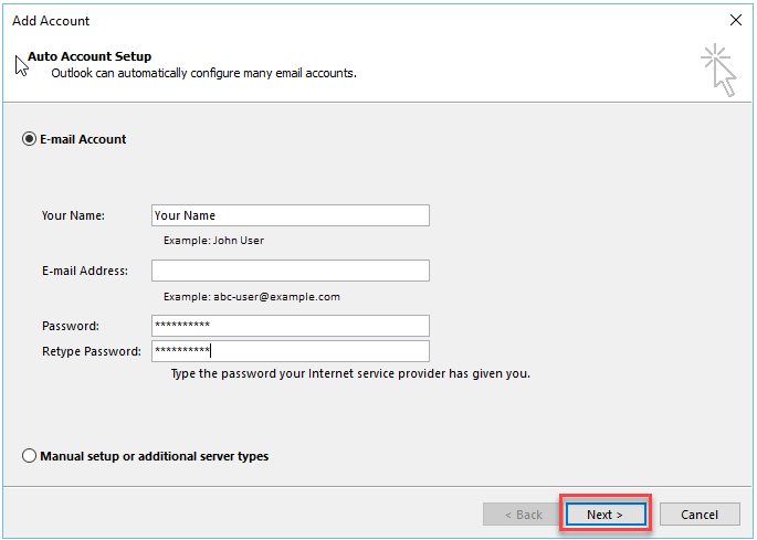 Click on Manual setup or additional server types, then click on the Next button at the bottom right of the window.