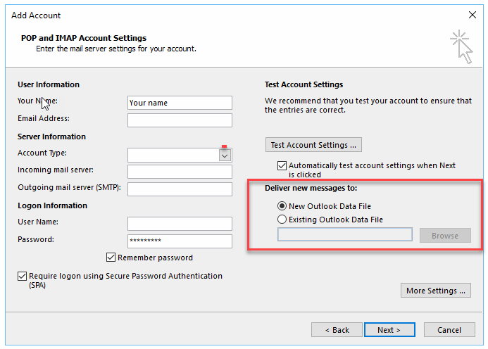 Determine where the new messages should be delivered to. You should only select "Existing Outlook Data file if you are importing an Outlook account with an existing Outlook 2016 Outlook data file.