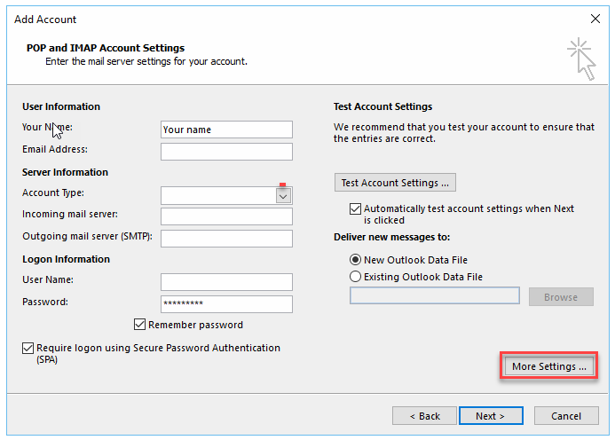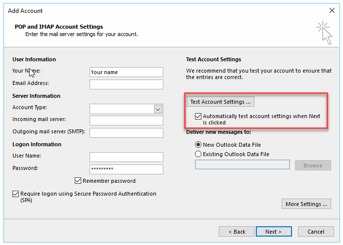 Click on Test Account settings (after entering all of the values), or click on the checkbox to automatically test account settings when clicking on Next. By default, the option is checked to automatically test when clicking on the next button. If the option is not checked then you will need test the settings by clicking on the test button.