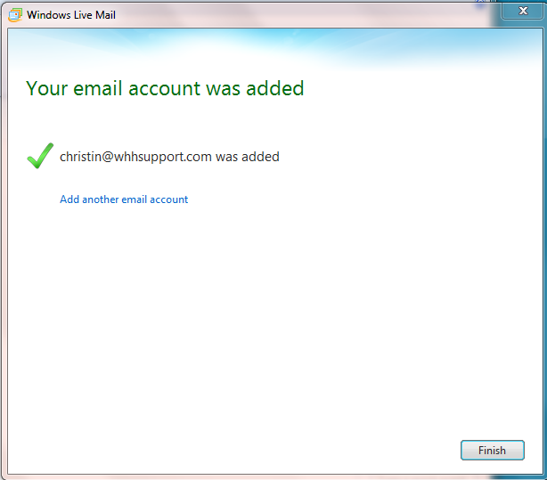 On the next screen you will see a message that your email account has been added. Click the Finish button to begin checking your email and be returned to the Windows Live Mail Accounts screen.