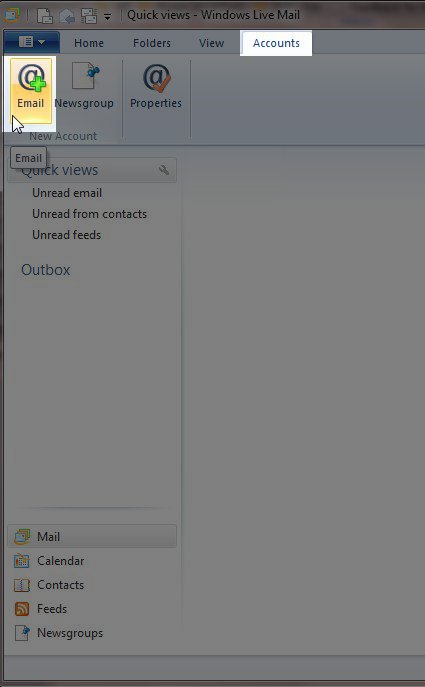 If this is your first time opening Windows Live Mail, the Add your email accounts window window should automatically pop up. If not, select Accounts in the menu bar and then click on the Email icon to bring up the Add your email accounts window.