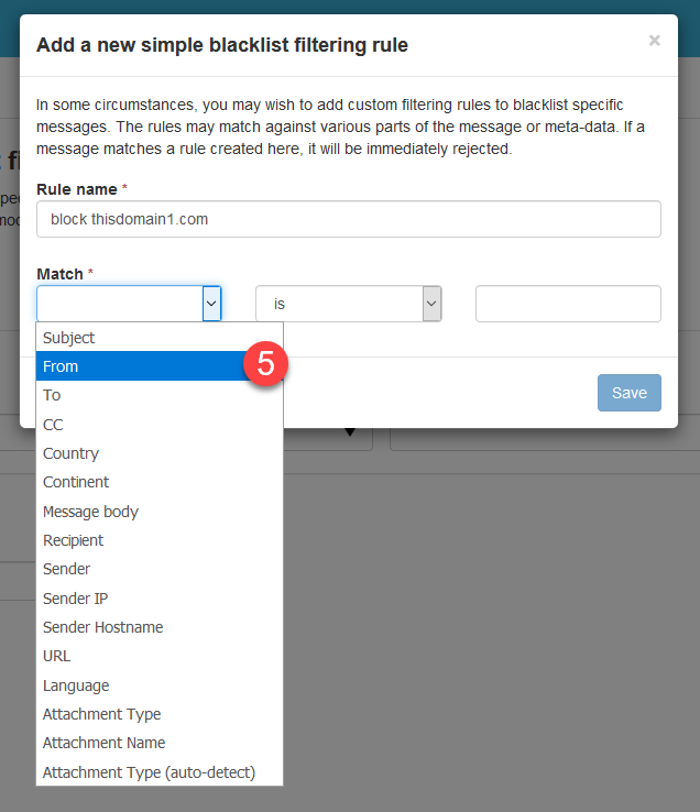 Tap on the drop-down menu under Match. This is the field that you'll be matching in the email. Since you're blacklisting email from a domain sending you email, this is normally going to be the From field.