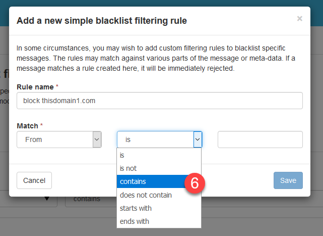 The second part of the rule is the conditional. Typically, the selection here is Contains. If you're not sure of the actual name, you might want to use "starts with" or "ends with".