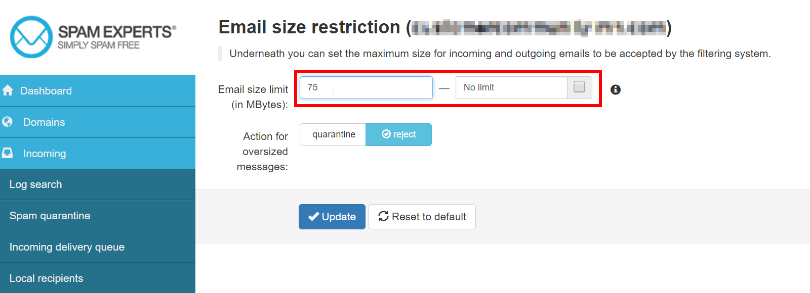 Select Update.You now know how to set an email size limit using the SpamExperts dashboard.