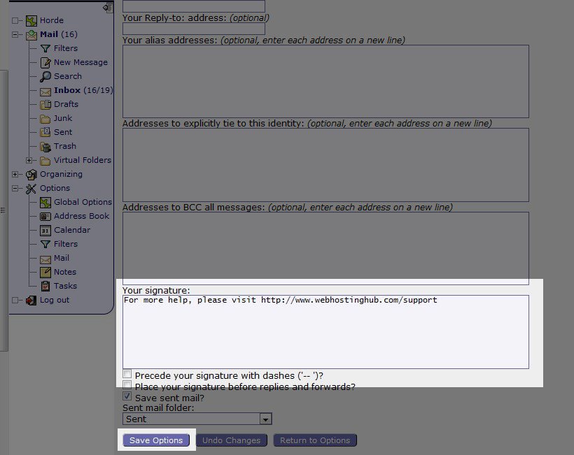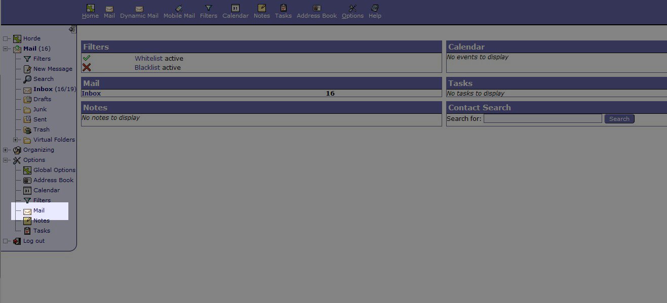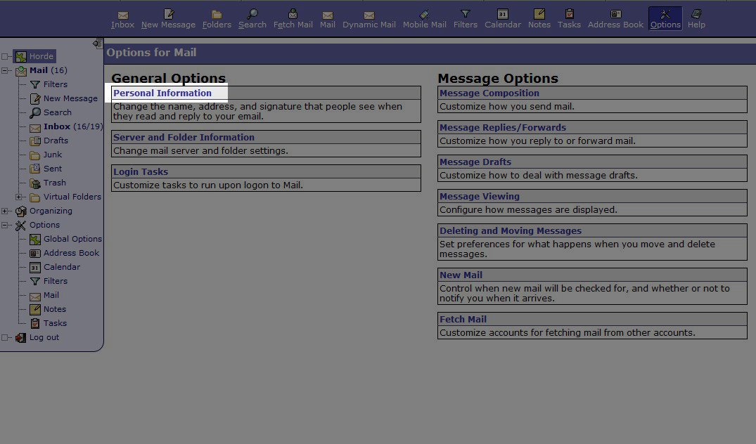 To have a signature on all of your outgoing emails, you can add one in Horde. First, log into Horde. Once you have logged in, click on Mail in the Options section: