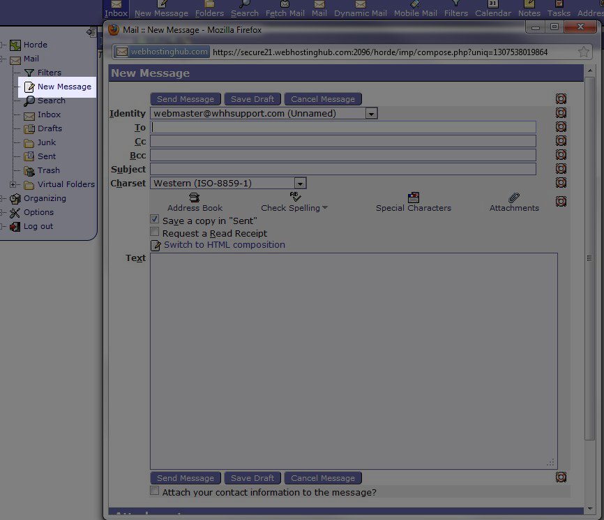 You can use your Horde webmail application to send email messages. This is great if you are out of town and away from your desktop client, but have an important email that you need to send. To compose and send a new email, click on "New Message" on the left menu and a new window will open: