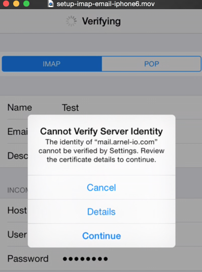 When you proceed to the next screen after filling your incoming and outgoing mail server settings, your iPhone 6 will try to verify the server settings that you have added. If the certificate has not been trusted then you will see an error message stating that your server can not be verified. Click on Details. You should be able to see that the self-signed certificate is identified with your server name. You can then select to trust the certificate. Once it is trusted, the server will be able to be verified.