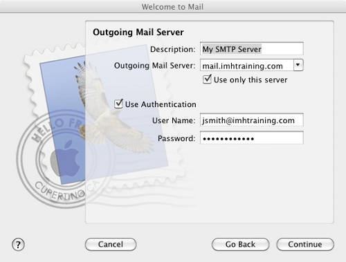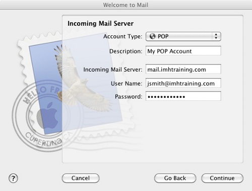Step 1: First, open up your Mac Mail on your computer, and you will get a screen like the one below. Fill out the requested information and click Continue. For the password field, make sure that you use the password for your email address and not the password for your cPanel.