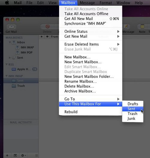 Step 2: Click "Mailbox" from the menu bar at the top, then go to "Use This Mailbox For" and in the box that opens up select "Sent." Now Mac Mail will use the Sent Folder in your account to store emails.