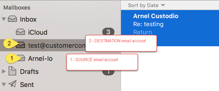 Select the destination folder or mailbox. Once you have selected the destination, the files will immediately be copied over. Note that using the drag-and-drop option MOVES the email from one account to the another as opposed to copying it.