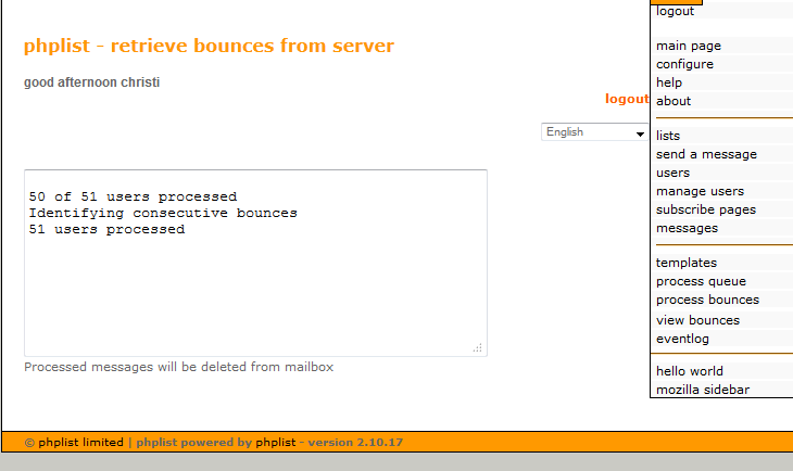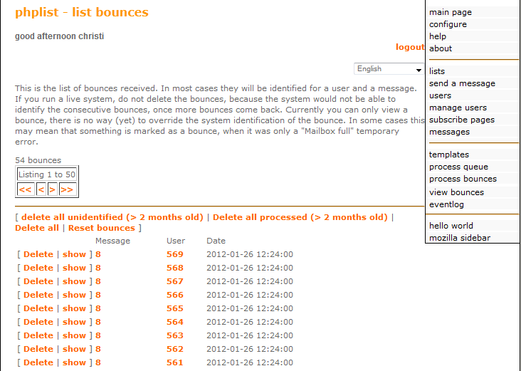 Each time you send a message to your list, it's a good idea to process and view bounces received. Please make sure that you have configured PHPlist to handle bouncebacks before proceeding with this step.