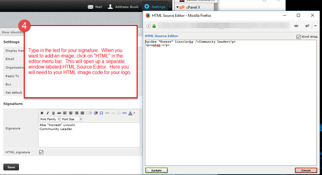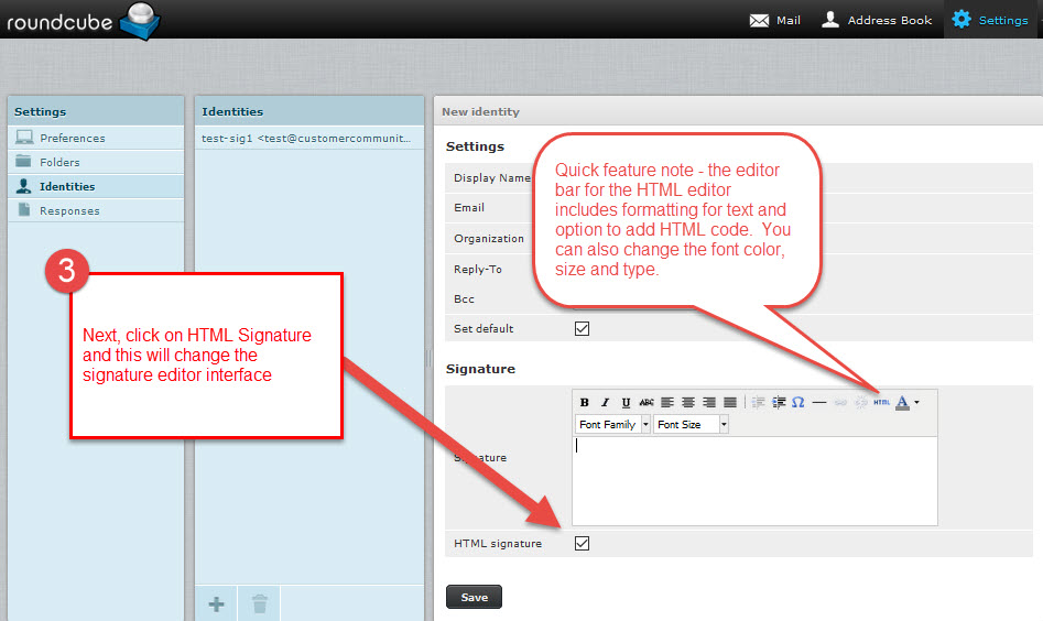 Next, click on HTML Signature in order to add the HTML tool bar in the Signature input field.