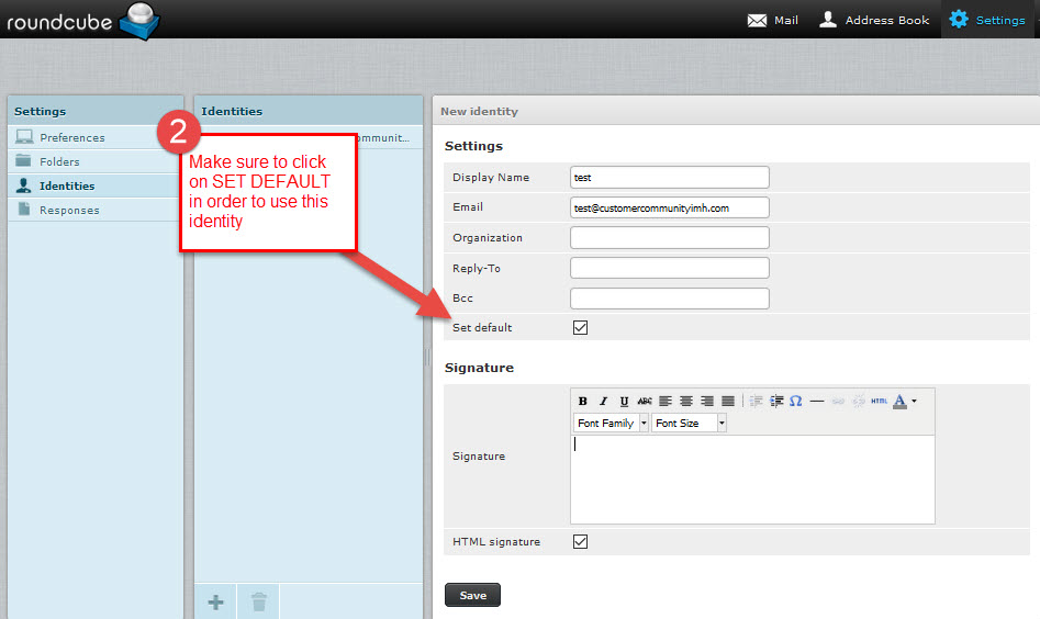 (Optional) There is usually a default identity already in place, but you can also create a new one by clicking on the plus sign at the bottom of the identities column. If you are creating a new identity, then fill in the information for that identity and make sure it's correct.