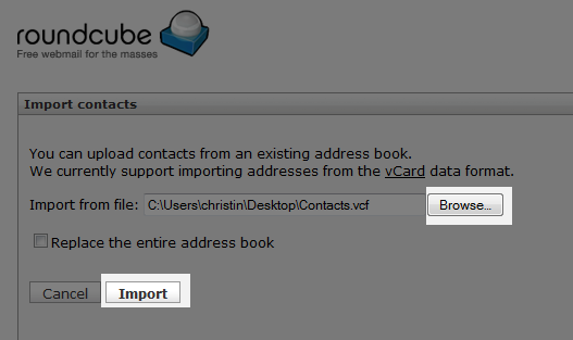 Please note, at this time, roundcube only supports the vCard format. If you cannot export or save your contact list to a vCard format, save it as a CSV (comma separated values) file. Then use one of the many free programs available that will convert your CSV file to a vCard file. One example is the online tool: CSV to vCard.