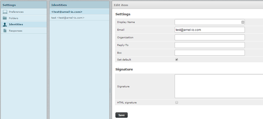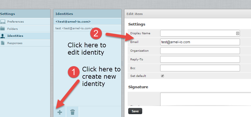 - On the Settings page, click on the "Identities" Tab, then click on the identity that you wish to edit. If you have no identities established, there will only be the default identity that you can select. You may also create a new identity by clicking on the plus symbol at the bottom of the identities list.
