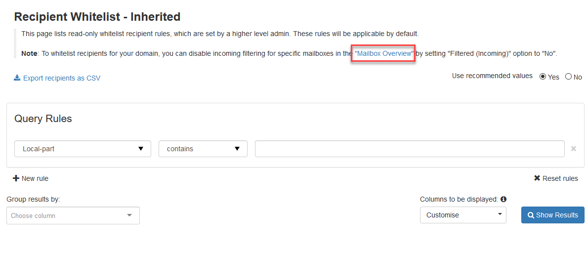 In order to whitelist recipients, you will need to disable incoming filtering in the Mailbox Overview. The Filtered (incoming) option should be set to "No." To do this, please start by clicking on Mailboxes Overview in the link at the top of the page.