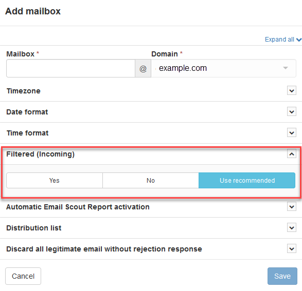 A pop-up window will appear where you can add the email address you're customizing the filtering settings for. Scroll down to the line labeled Filtered (incoming). Click on No.