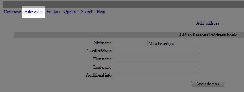Once you have logged into your SquirrelMail, you can add contacts to your address book. This can be done in the "Addresses" tab at the top of the page: