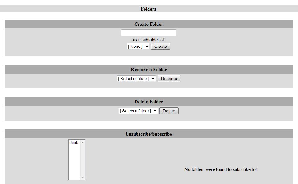 To manage your folders, click the "Folders" link in the top menu of Squirrel Mail. The Folders option at the top of SquirrelMail allows you to: