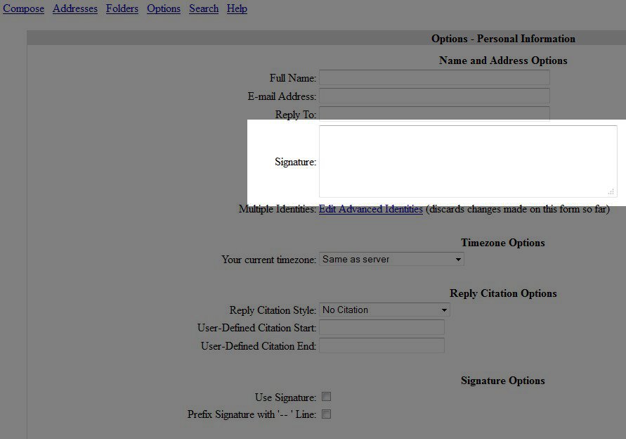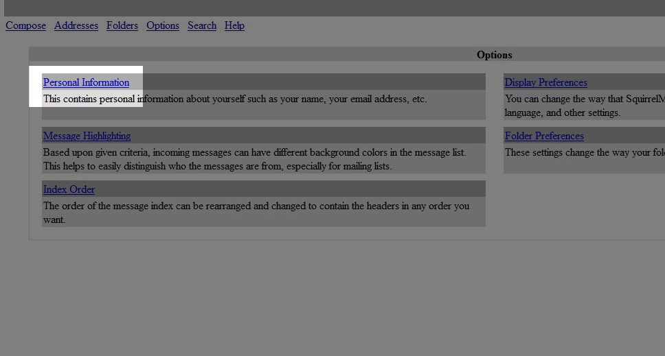 To have a signature on all of your outgoing emails, you can add one in SquirrelMail in the Personal Information section. First, log into your SquirrelMail and click on Options at the top of the screen. This will bring up the following window: