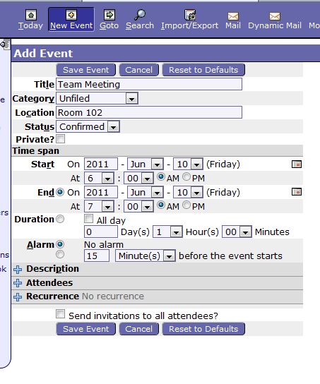 There are two ways to add events and reminders to your calendar. You can click the + icon next to the date to add a new event, or you can click the New Event button on the Menu. Once you have chosen by either method to create a new event, you will be able to put in the event information: