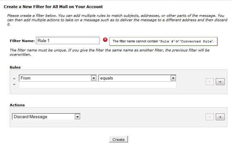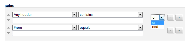 If you wanted to add a range of IP addresses, you could do this in Step 6. You can also add further conditions by simply clicking on the "+" sign to the right of the RULE. Bear in mind though that you would need to make sure that the connecting article says "OR" in order for any ONE rule to apply to the email you're trying to block. If you set it to "AND" (which can be selected as per the screenshot at right), then BOTH rules must be true before the ACTION (set to Discard Message) will take place. If you're unsure of how to use multiple rules, then keep it simple and leave it at one rule.