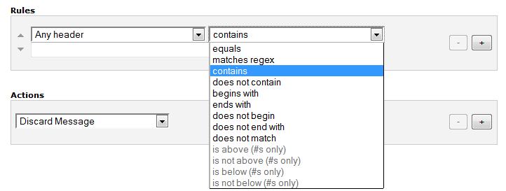 this article seems to have moved. i wanted to block all emails from a range of IP addresses (starting with 107.179.2.) so I just selected Any header then Contains, then i typed the start of the IP address: 107.179.2. it seems to work now, im so glad, spam is a nightmare |