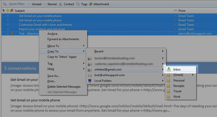 2. Right click on the email messages. In Thunderbird, mouse over "Copy To" and then select the inbox you want to copy the emails. Remember this will be the email account set up with Web Hosting Hub: