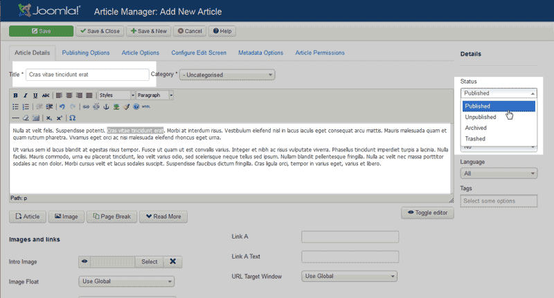 The Status must be set to Published, You will need a Title for the Article, and the content for the article.
