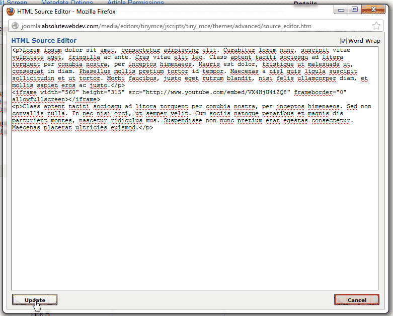 Add the HTML for the iframe to the code. The below code is what we are adding to the Source editor.