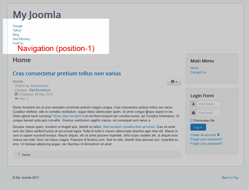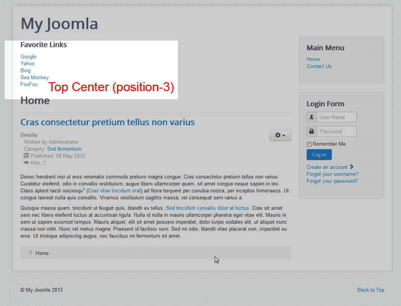 The Top Center position is much like the Navigation position except it is lower and the Menu Title will display on top if the Menu. This location will also need CSS styling to have it appear appropriately. See the image to the right for the Top Center position in Joomla.