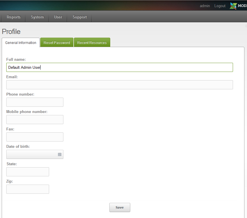 - The PROFILE form will appear to the right. You will see three tabs: General Information, Reset Password, and Recent Resources. The General Information section will look like the following screenshot:
