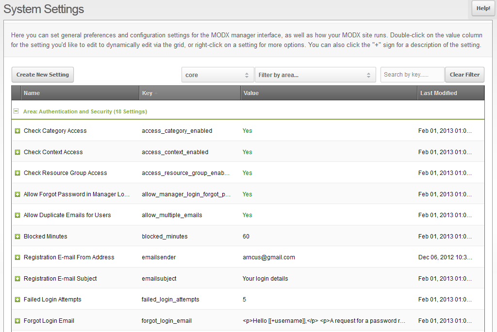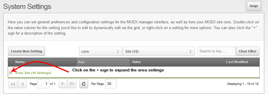 - When you look at the Systems Settings menu you can see that there are a large number of system settings for the Modx application. However, for the purpose of this tutorial we will only be modifying the SITE NAME setting. Here's a portion of the menu that you will initially see: