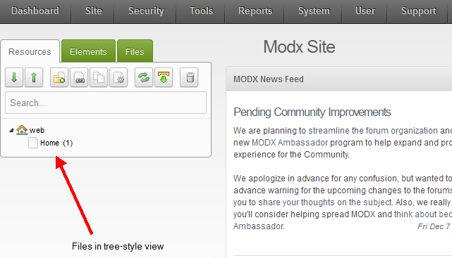 As you begin to use Modx, you will encounter many files and references to files. Modx provides a very useful way to view and make changes to these files with the tree-style interface to the left of the backend manager. Here’s a screenshot indicating its location: