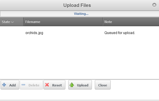 Click on ADD as per the screen above in order to search for the file that you wish to upload. You can add your own file(s). The screen above shows that I have selected the orchids.jpg file and it is ready for upload.
